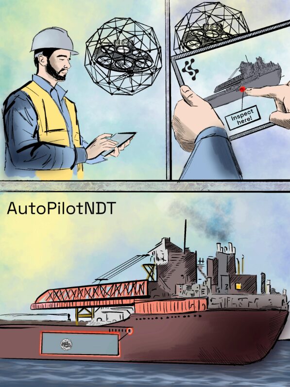 Description of the solution: A two-part technology solution that enables users to easily monitor and guide an autonomous contact NDT with an aerial vehicle by integrating the autonomy stack and the web application-based user interface.