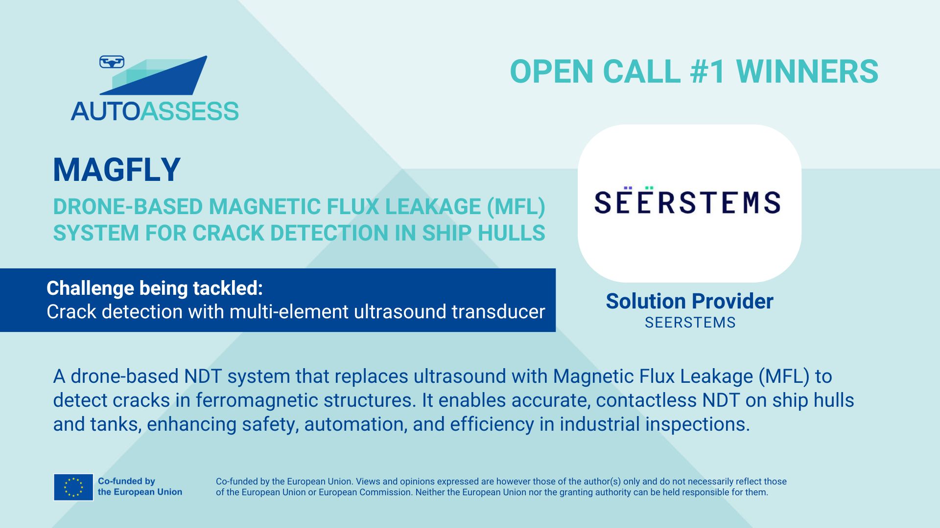 MAGFLY is being developed by Seerstems Robótica y Sistemas S.L., a company specialised in robotic inspection and NDT automation. The system’s modular design makes it adaptable to various industrial contexts, from maritime hulls to storage tanks and wind turbines. Fully aligned with AUTOASSESS objectives, MAGFLY enables autonomous, standardised, and safe inspection operations, reducing risks for workers and paving the way for predictive maintenance in the European maritime industry.